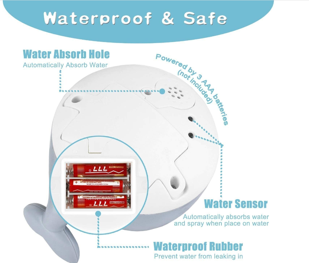 • Easy to Use --The infant tub toys powered by 3 AAA batteries(not included). Water toy has a automatically senses, just install the batteries, and place it on the water, it will automatically induction absorbs water from the bottom and sprays appropriate height water column. When leaves water, all effects will stops immediately. No manual operation is required.(Notice:Please take baby toy out when not in use and dry the water above.)