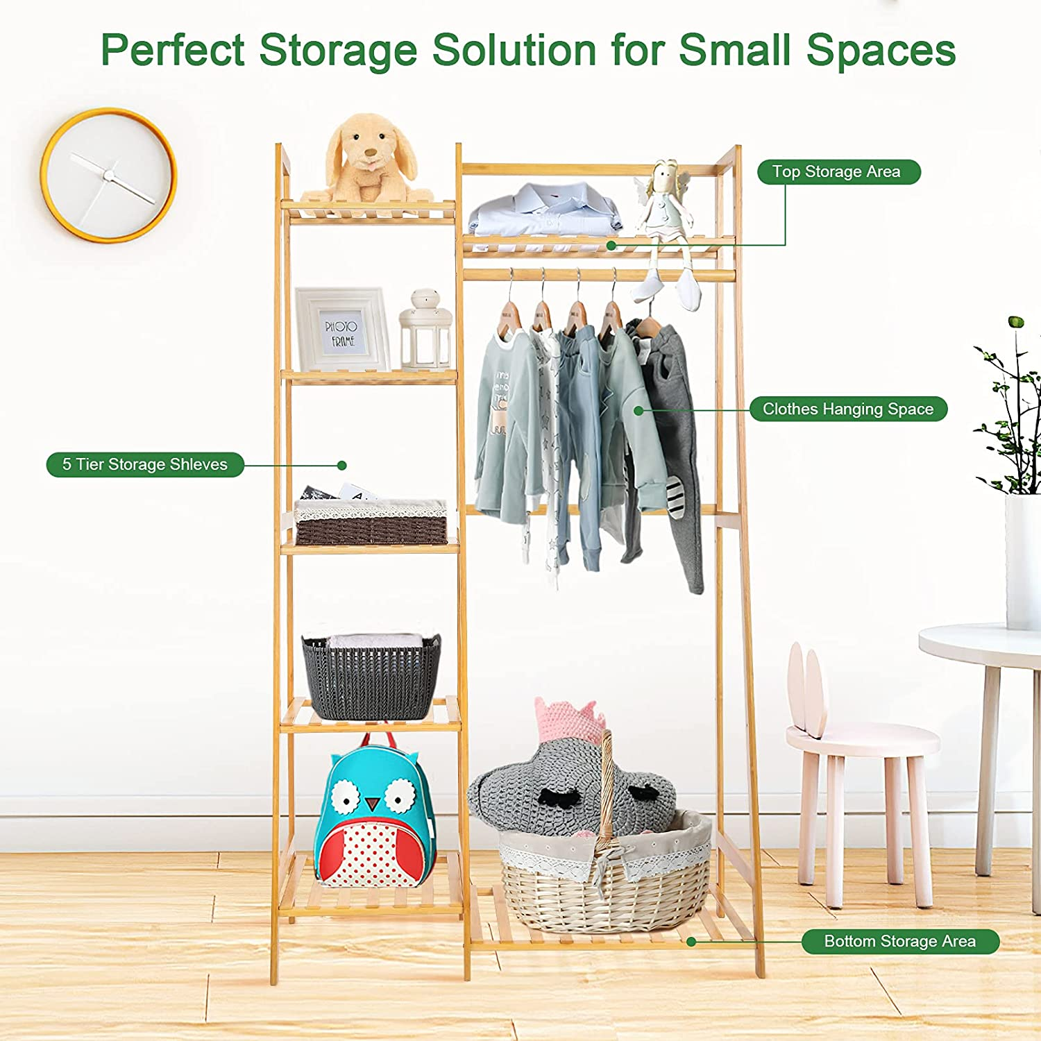Bamboo Rack with 7 Tier Storage Shelves Clothing Hanging Stand for Small Spaces