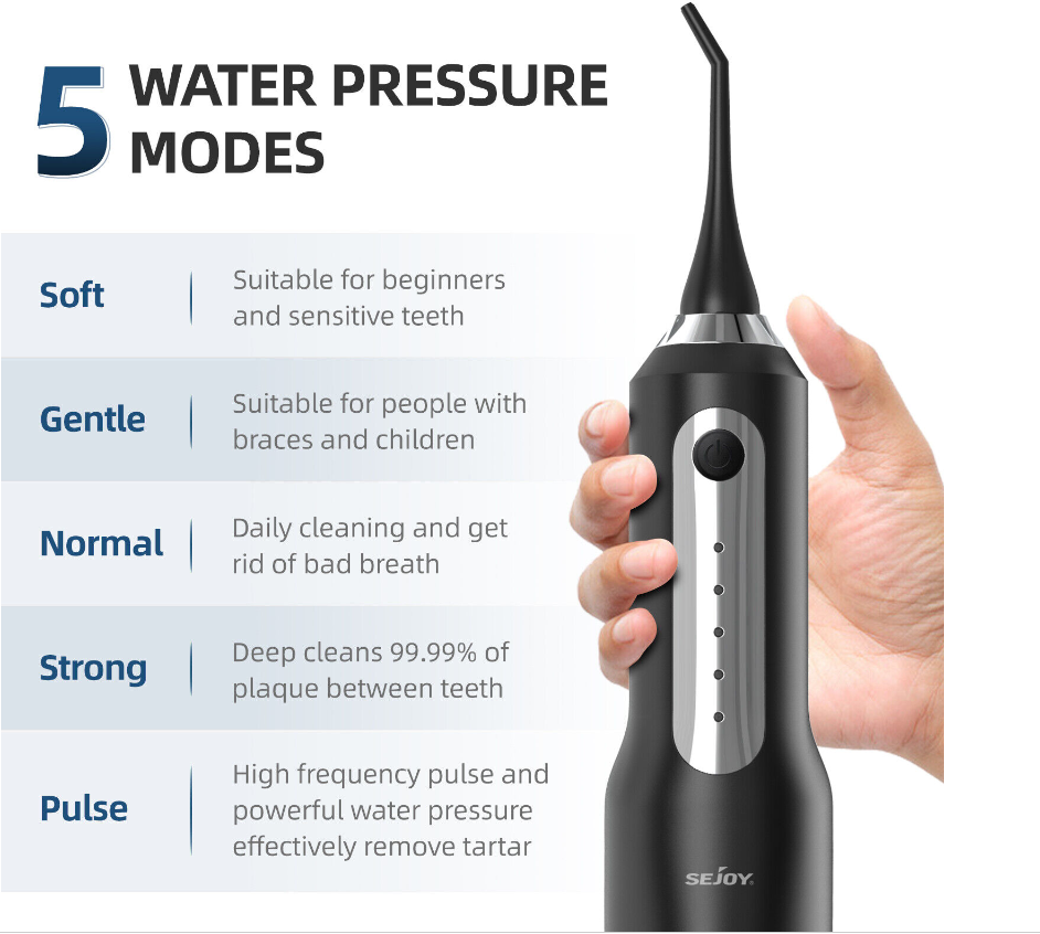 • 【With Unique Pulsation Technique & Deep Cleaning】SEJOY water flosser can offer 1000-1400 times/min high-pressure water pulse, efficiently removing 99.99% plaque and food residue thoroughly deep between teeth or gumline in every corner where traditional brushing can not reach, keeps your breath fresh and improves your gum heal